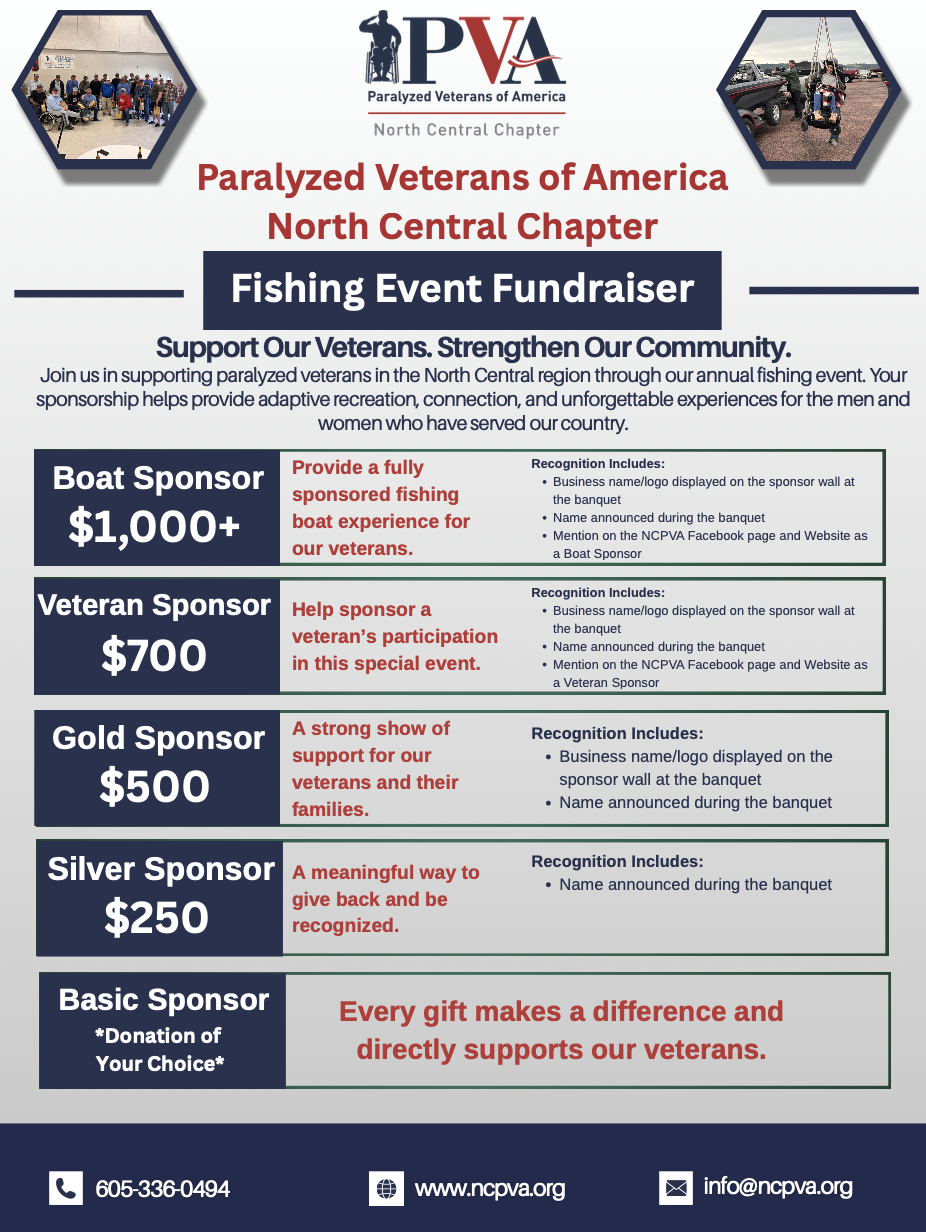 The NCPVA is looking for people and businesses who are interested in sponsoring a boat, veteran, or making their choice of donation for our upcoming Fishing Event in May 2026.